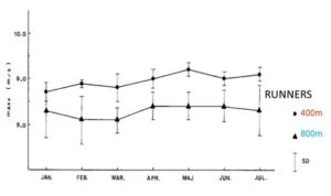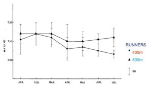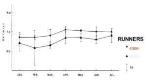 During competition season of two groups of 100-400 m and 400-800 m runners the , speed endurance (HV) and blood pH after 3×300 m running test with 1 min recovery were observed from start of the first preparatory period to the end of competition season in July.